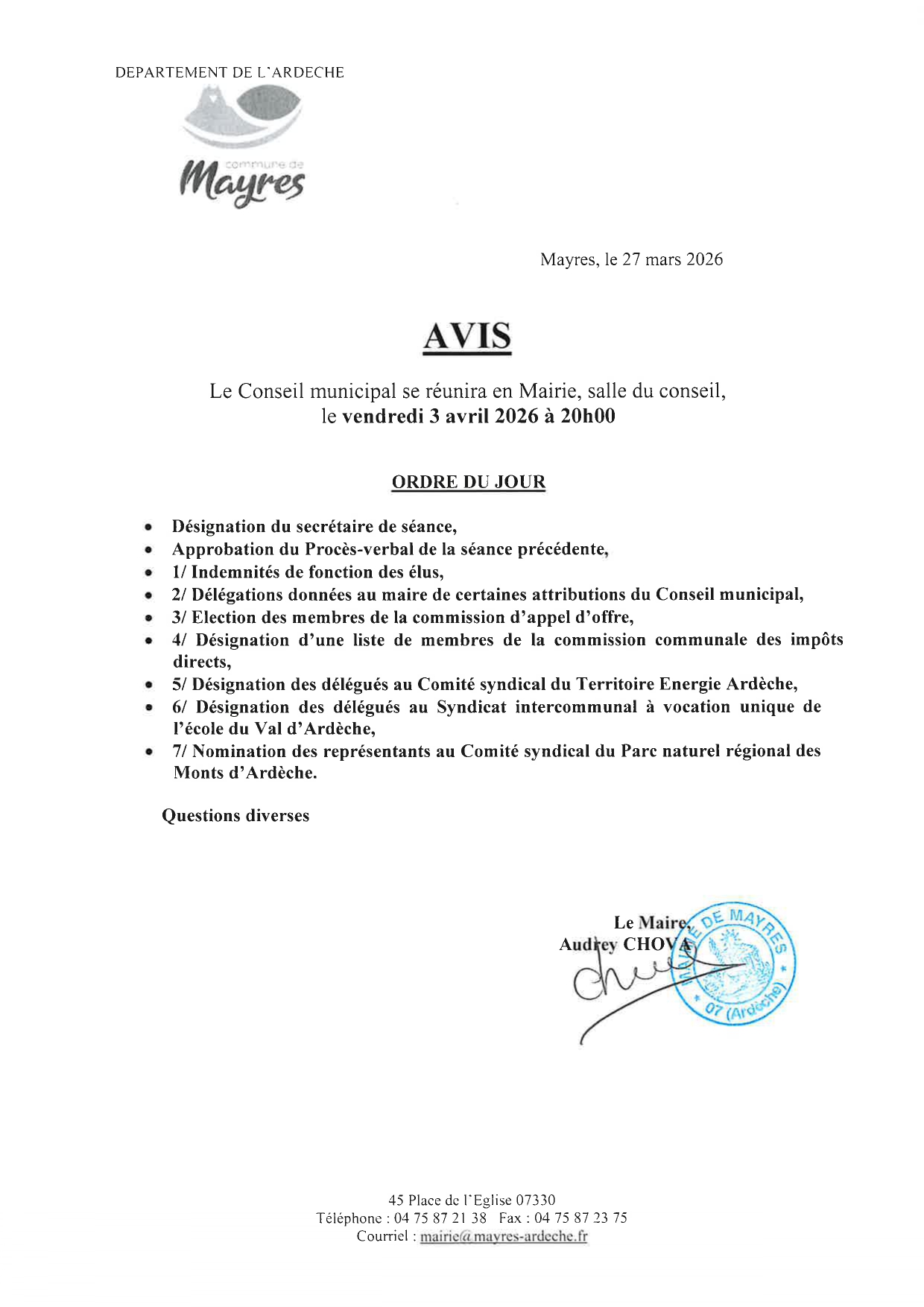 - Le vendredi 3 avril 2026 à 20h00 : CONSEIL MUNICIPAL