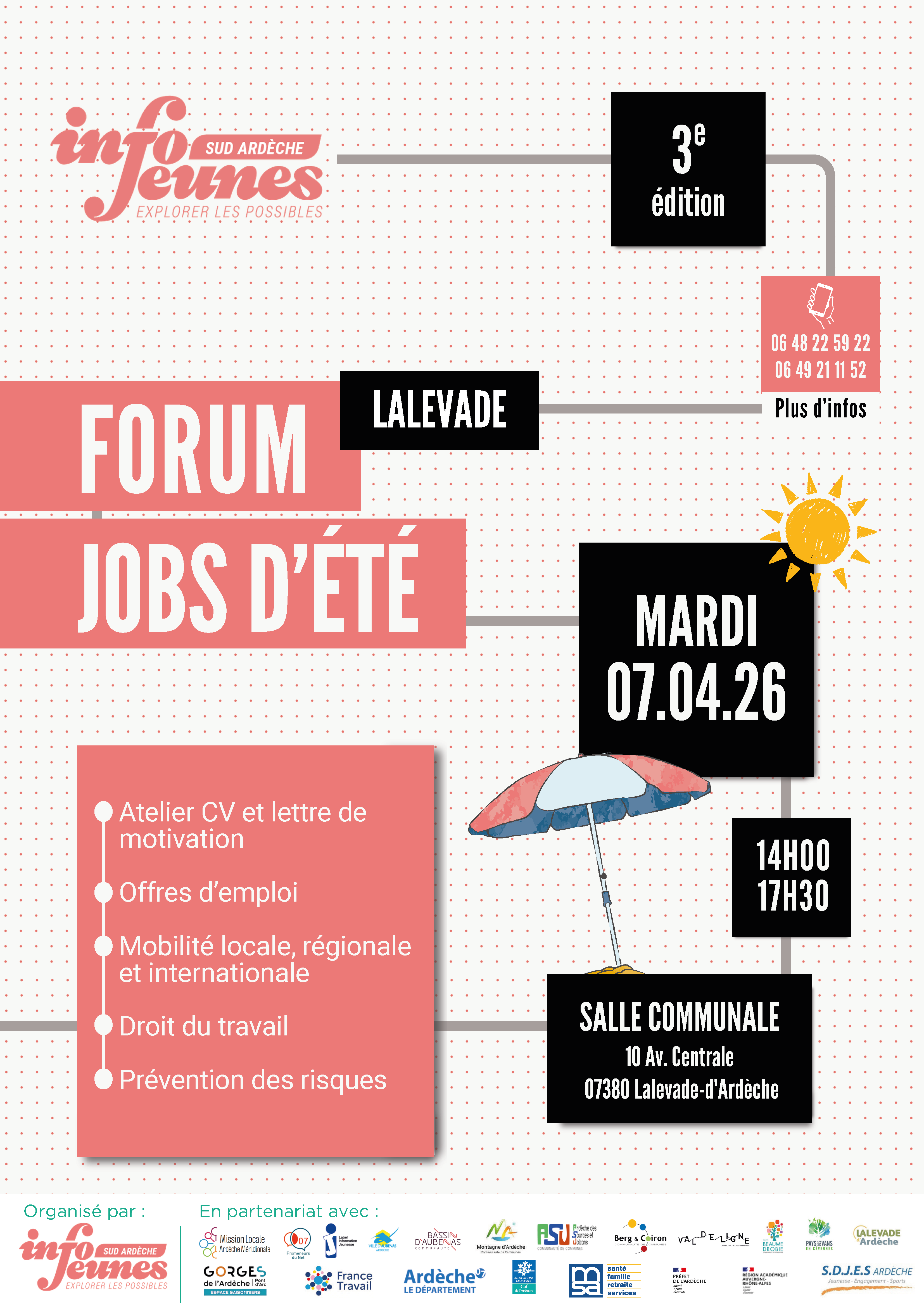 En partenariat avec la communauté de communes Ardèche des Sources et Volcans, les communautés de communes du sud Ardèche et la ville d’Aubenas, le service Info Jeunes Sud Ardèche et le Service Emploi de la Mission locale Ardèche Méridionale organisent la 3ᵉ édition du Forum Jobs d’été, qui se tiendra le mardi 7 avril 2026 de 14h00 à 17h30 à Lalevade-d’Ardèche.
